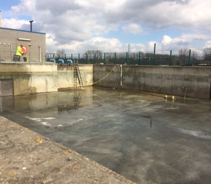 Door de jaren heen hadden slib en planten zich opgestapeld en kwam de veiligheid van het bluswater systeem in het gedrang. We kregen de opdracht om slib, planten en restwater te verwijderen, de wanden af te spuiten en de pompkamers te reinigen.