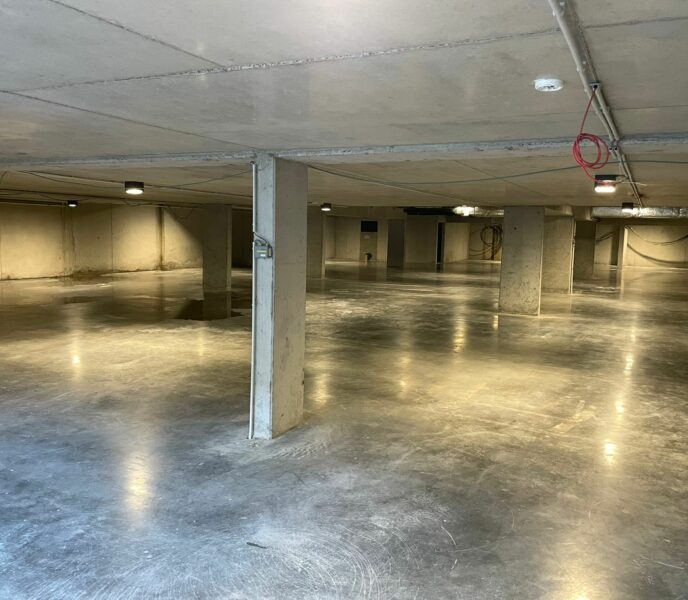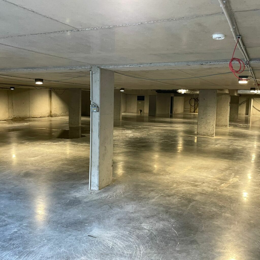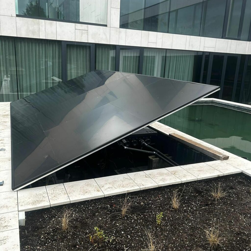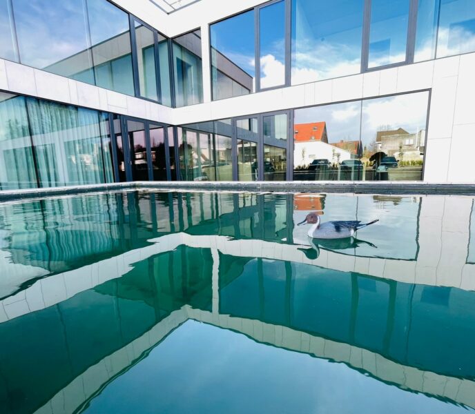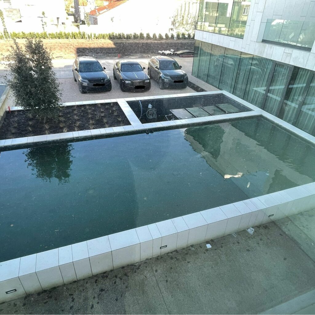 Deze enorme koivijver, met een inhoud van 75.000-80.000L, zweeft volledig boven een ondergrondse parking van twee etages. De vijver is ongetwijfeld het meest unieke project dat we al verwezenlijkt hebben.