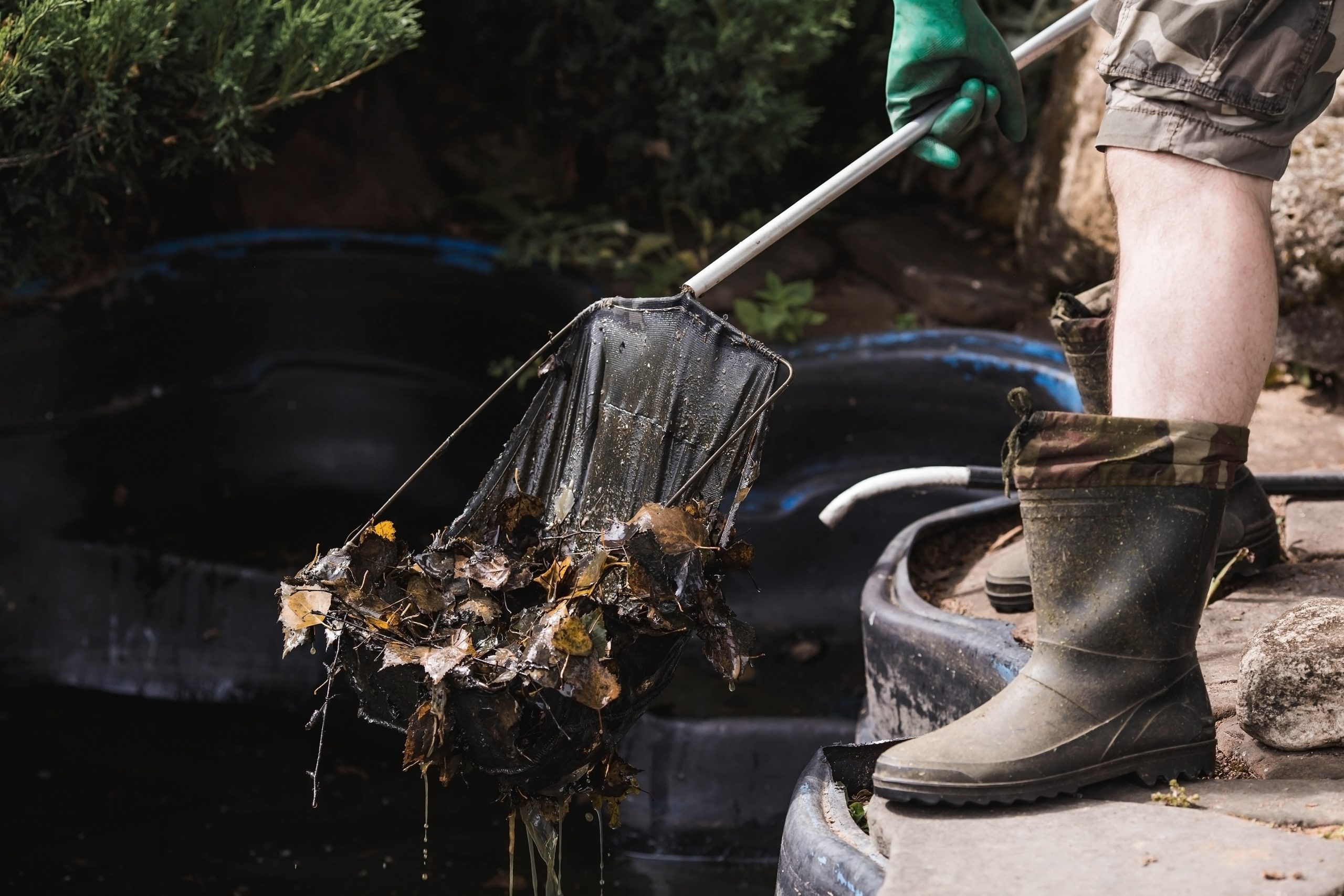 Beginnen doen we als het ware met de grove borstel: het verwijderen van bladeren, takjes en ander grof vuil. Dat kan gemakkelijk met een schepnet. Sla deze stap niet over, want bladeren en ander organisch afval kunnen ophopen op de bodem van de vijver. Dat komt de waterkwaliteit absoluut niet ten goede.